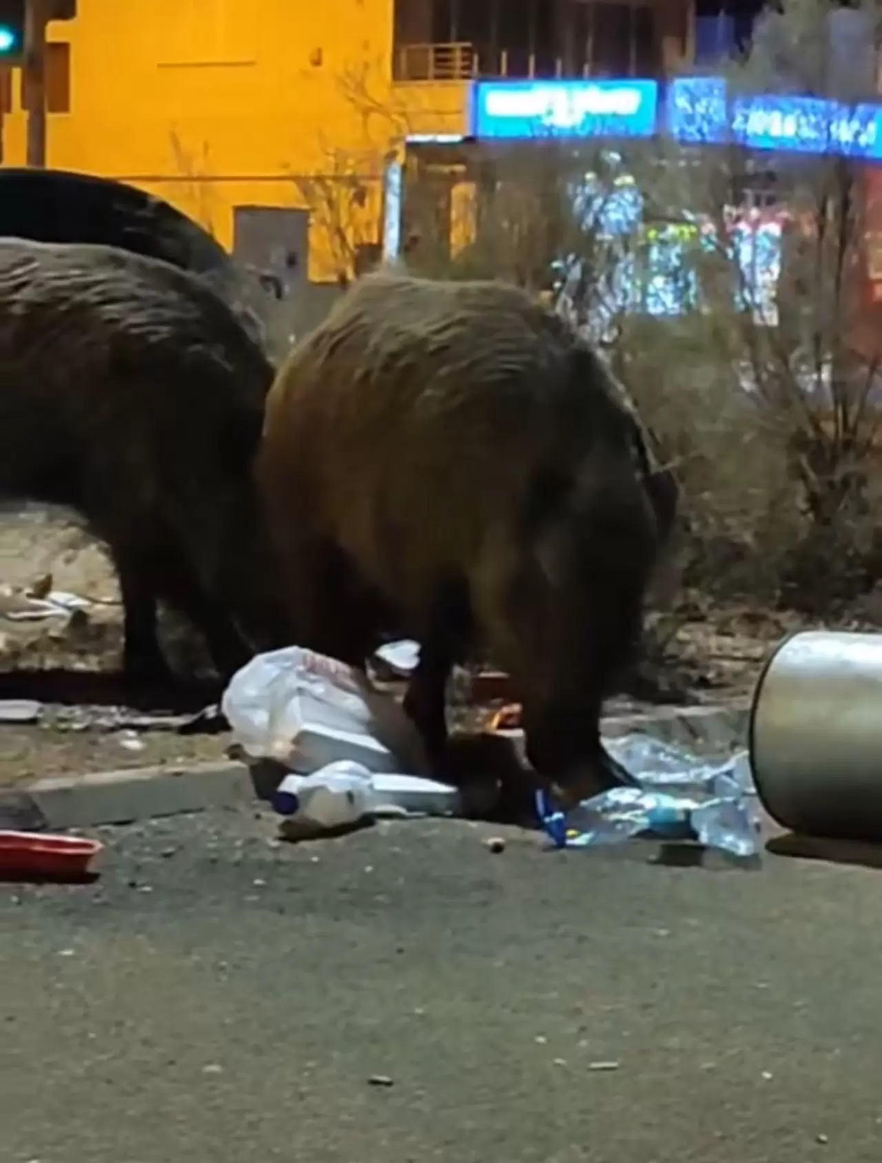 Çöp yığınlarını karıştırarak yiyecek arayan domuzlar, iri cüsseleriyle dikkat çekti. Sosyal medyada videonun paylaşılması üzerine bazı vatandaşlar "Şunlara bak fil kadar olmuşlar" yorumlarında bulundu.