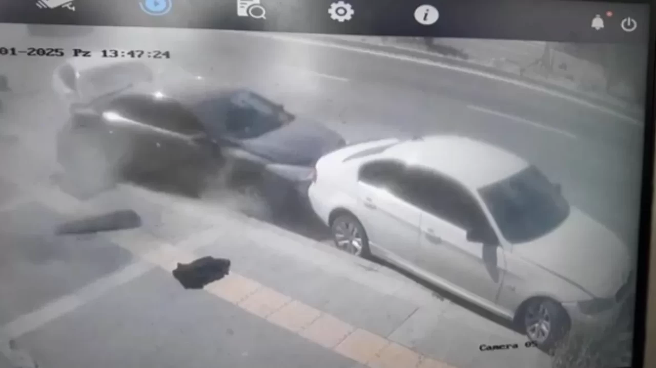 Çarpmanın şiddetiyle sürücü yaralanırken, park halindeki 4 araçtan 1’i perte çıkarken, 3 araçta maddi hasar oluştu. Kaza anı anbean güvenlik kamerasına yansıdı.