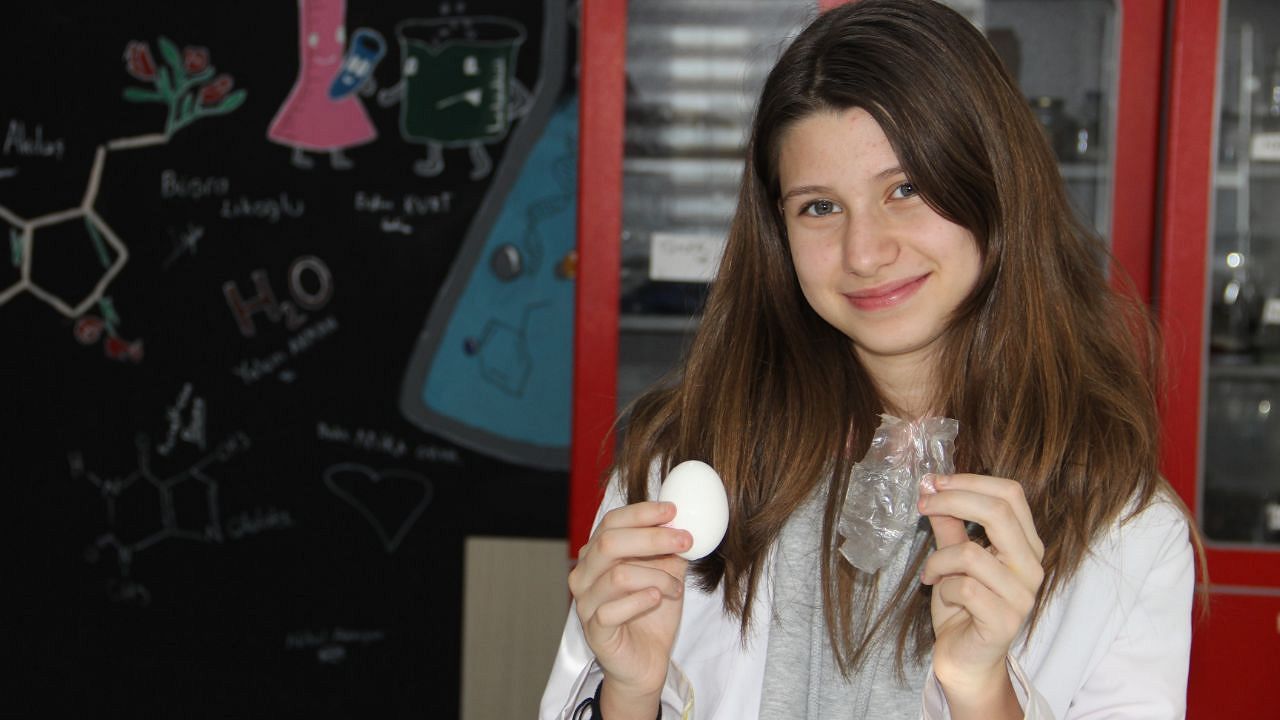 BİLSEM Kimya Öğretmeni Yıldız Leblebiciler de projenin amacının küresel ısınma nedeniyle yaşanan afetlerde önemli bir besin olan yumurtanın raf ömrünü uzatmak olduğunu kaydetti. Leblebiciler, “Dışarı çıkması esasına dayanarak bir biyo film hazırladık ve plastik bileşenlerde ilave ettik ve yumurtayı daldırma yöntemiyle kapladık. Sonra oda sıcaklında depoladık ve bu süreçte de yumurtadaki kalite değişikliklerini takip etmek için çeşitli testler uyguladık. Onların sonucunda da yaklaşık 2 ay kadar bozulmadan oda sıcaklığında kalabildiğini gördük. Tabi bu çalışmayı esas planlamamızın nedeni; küresel ısınma nedeniyle dünyanın yaşadığı sıkıntılardı, Felaketlerdi. Özellikle ülkemizin son yıllarda yaşadığı seller, orman yangınları, en son 6 Şubatta yaşadığımız deprem gibi felaketlerde karşılaşabileceğimiz gıda sıkıntısına çare bulabilmek için önemli bir diyet ürünü olan yumurtanın soğutucu olmadan, elektrik enerjisini kullanmadan ne kadar uzun süre bozulmadan durabileceği adlı çalışmaydı” diye konuştu. İHA