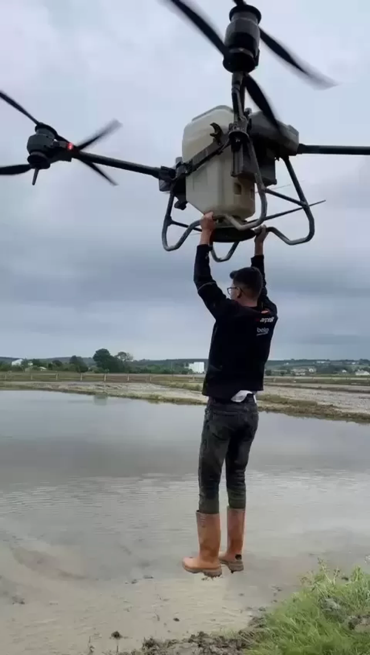 Bafra ilçesinde bir çiftçi, çeltik tarlasını ilaçlamak için kullanılan tarım dronuna tutunarak havalandı ve tarlanın bir ucundan diğer ucuna uçtu. O anlar cep telefonu kamerasına yansıdı.