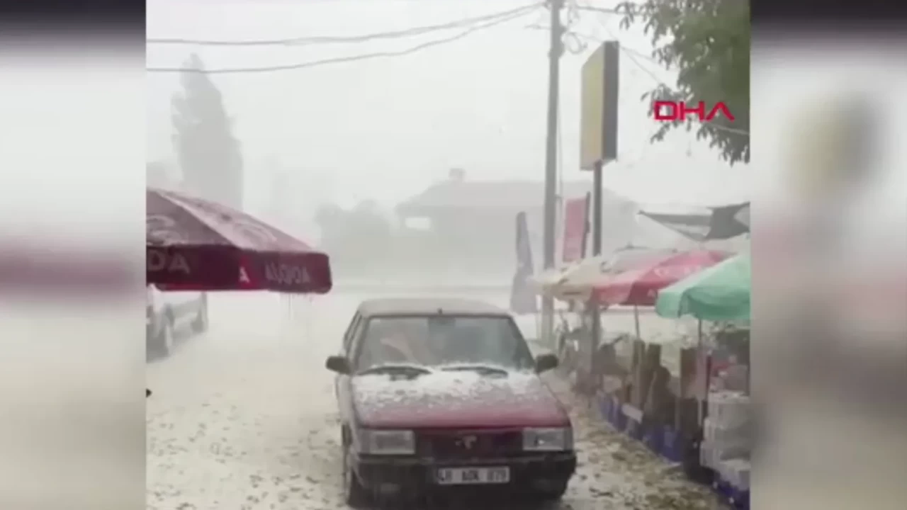 Muğla’nın Seydikemer ilçesine bağlı Yayla Bekçiler Mahallesi'nde saat 16.00 sıralarında başlayan dolu yağışı, kısa sürede etkili oldu. Meteoroloji’nin uyarılarının ardından gelen yağışla birlikte tarım alanları, sokaklar ve caddeler beyaza büründü.