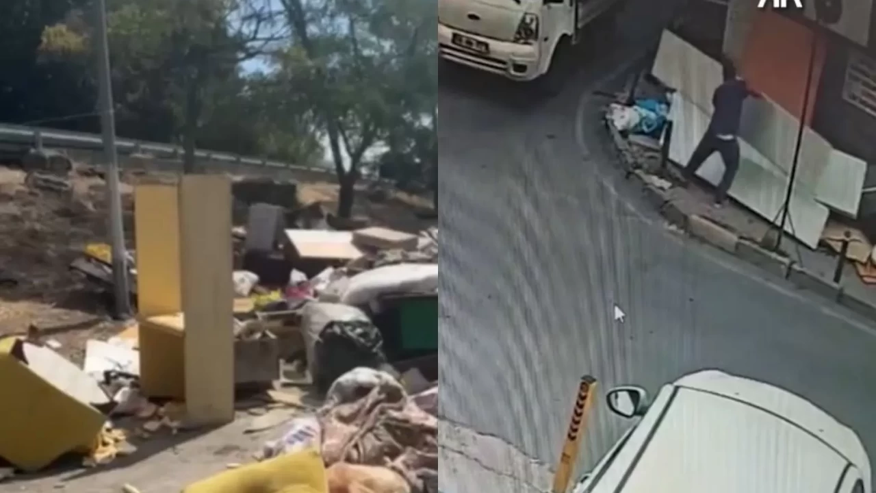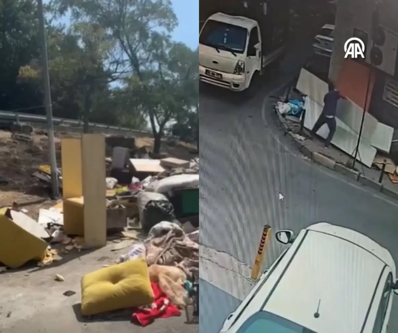 Atık eşyaların yol kenarındaki çöp yığınlarının bulunduğu yerlere araçla bırakıldığı anlar ise cep telefonu ve güvenlik kamerasınca kaydedildi.