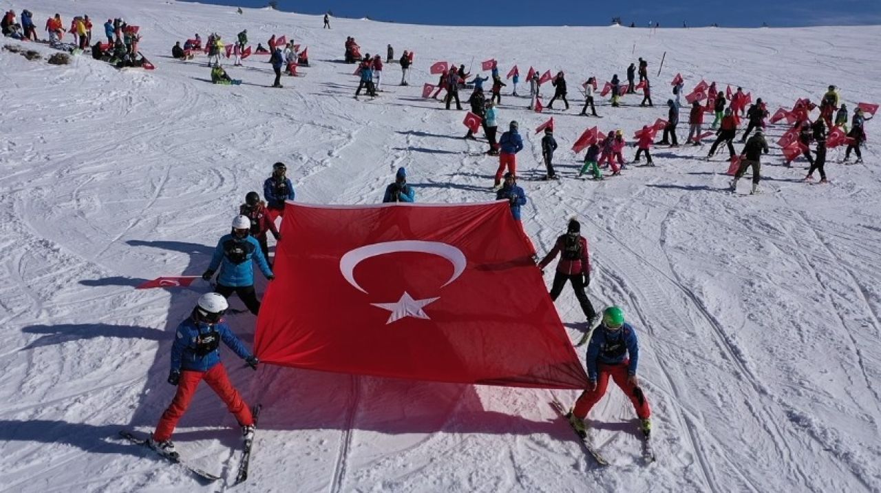 Bolu’nun turizm merkezi Kartalkaya’da Türk bayraklı 500 kayakçının katıldığı organizasyonda İdlib şehitleri anıldı.