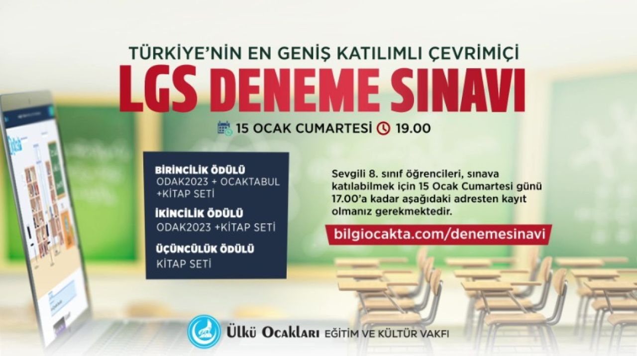 Haydi gençler, Türkiye'nin en geniş katılımlı LGS sınavına ücretsiz katılın! Sınava girebilmek için 15 Ocak 2022 Cumartesi saat 17:00'a kadar bilgiocakta.com adresine girerek kayıt formu doldurmanız gerekmektedir. Sınav tarihi 15 Ocak 2022 Cumartesi Saat 19:00. Haydi Türk Gençliği, Ülkü Ocakları'nın düzenlediği Türkiye'nin en büyük çevrimiçi 8. Sınıflar LGS sınavına...