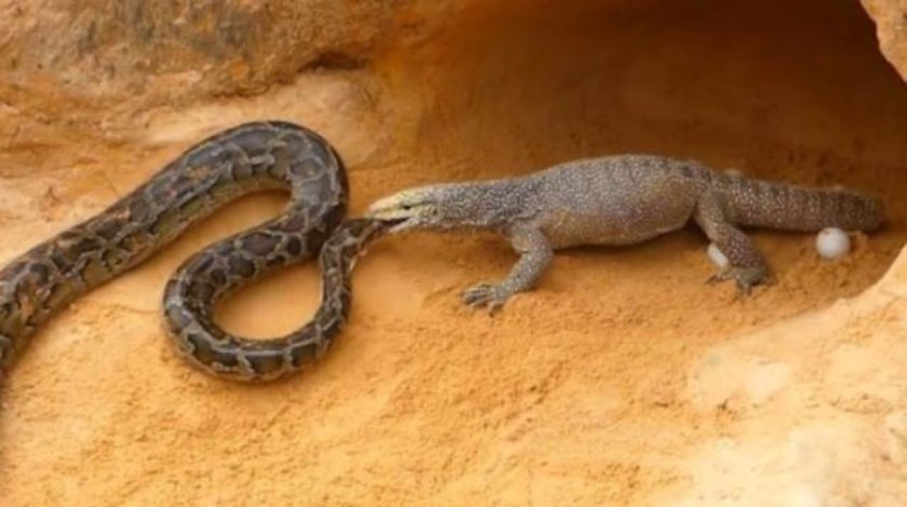Doğal yaşama ilişkin videolar, sosyal medyada ve çeşitli mecralarda gündem olmaya devam ediyor. Yavrularını pitondan koruyan komodo ejderi ile piton arasındaki mücadelede nefes kesti. Ejder, pitonu yuvasından uzak tutmayı başardı.