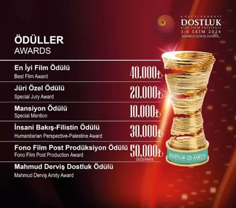 Festivalin dostluk temalı 'Ana Yarışma' bölümünde 'En İyi Film Ödülü'nü kazanan yapıma 40 bin, 'Jüri Özel Ödülü' kazanan yapıma 20 bin, bir yapıma da 10 bin liralık 'Mansiyon' ödülü verilecek. Bir yapım da 50 bin lira değerinde 'Fono Film Post Prodüksiyon Ödülü' kazanacak. Gazze'de yaşanan drama ışık tutan filmlerin yarıştığı 'İnsani Bakış-Filistin' bölümünde bir yapıma da 30 bin lira değerinde 'Mahmud Derviş Dostluk Ödülü' takdim edilecek. Kazananlara ayrıca festivalin ödül heykeli de takdim edilecek. Kazananlar, 6 Ekim'de AKM Tiyatro Salonu'nda gerçekleşecek galada açıklanacak.