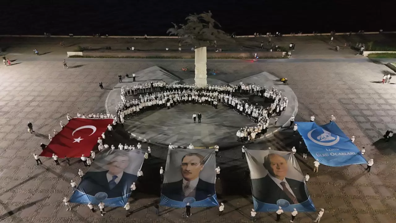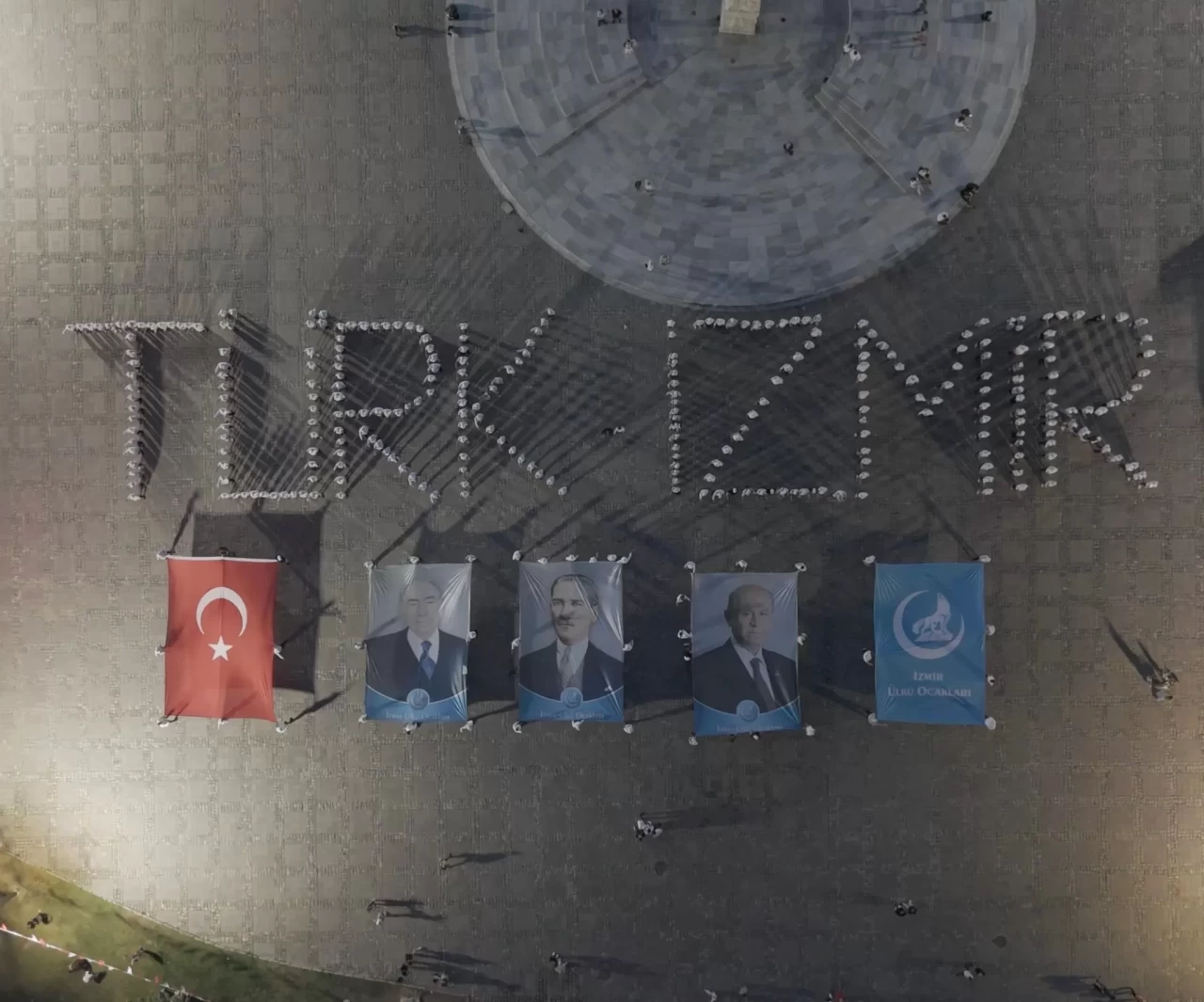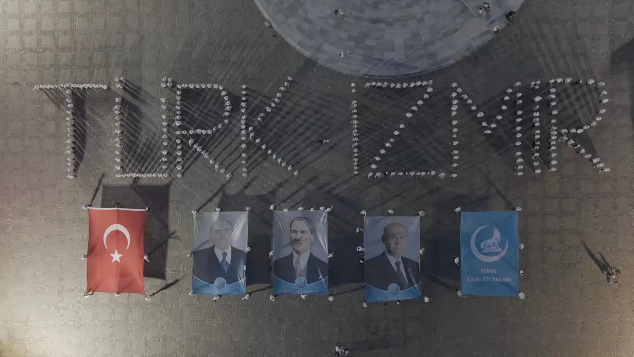 İzmir Ülkü Ocakları’na mensup 550’yi aşkın beyaz giyinmiş genç kareografik olarak”TÜRK İZMİR” yazısını oluşturdu. Yazıyı, büyük Türk bayrağı; 10’ar metrelik Mustafa Kemal Atatürk, Alparslan Türkeş ve Devlet Bahçeli fotoğrafları taçlandırdı.
