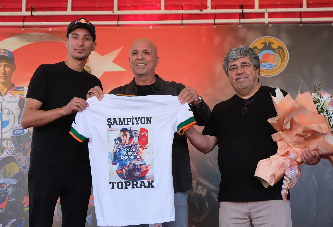 Toprak Razgatlıoğlu'na konuşmasının ardından Servet Ünlü ve Hasan Çavuşoğlu tarafından çiçek ve 'Şampiyon Toprak' yazılı Alanyaspor forması hediye edildi. Tören fotoğraf çekimlerinin ardından son buldu.