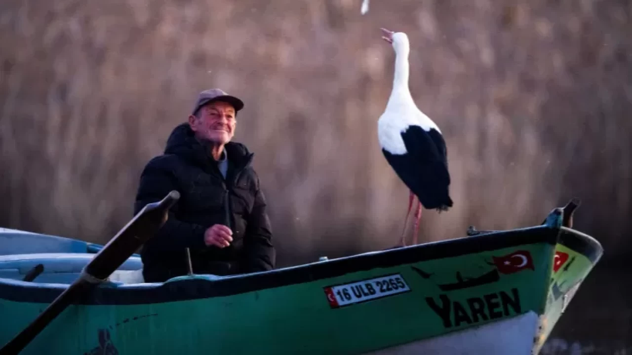 Yaren leyleğin, göl manzaralı yuvasının bulunduğu mahallede balıkçı Yılmaz'ın kayığındaki "geleneksel" pozu, doğa ve yaban hayatı fotoğrafçısı Alper Tüydeş tarafından kayda alındı.