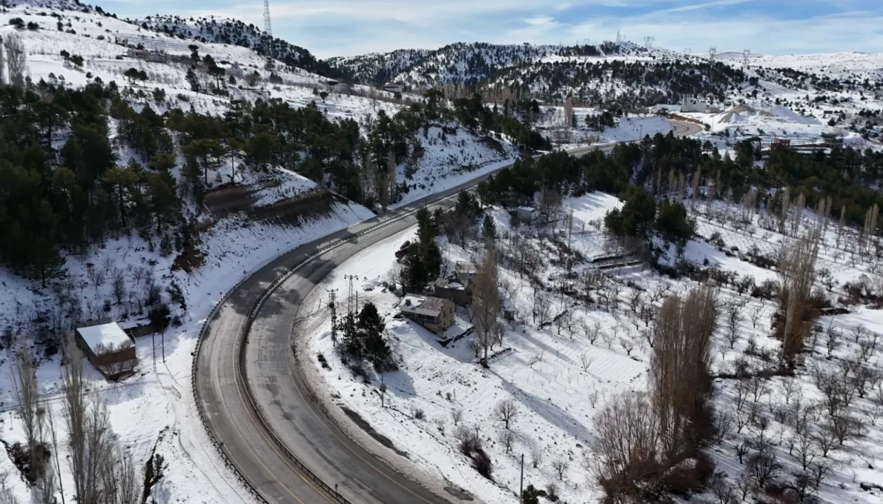 Beyaza bürünen köy ve çevresi dronla görüntülenirken, oluşan manzara havadan kaydedildi.