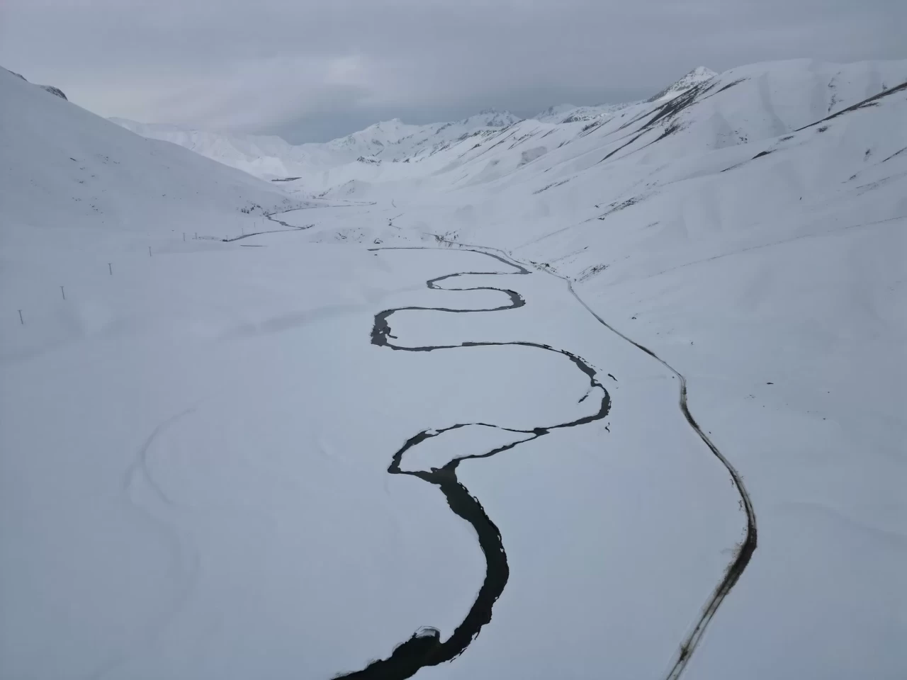 Şırnak'ın Beytüşşebap ilçesine bağlı Yeşilöz Faraşin Yaylası'nda kilometrelerce uzanan dev menderesler, yılın 4 ayı buz pistine dönüyor. Havaların ısınmasıyla çözülen dere yatağı dron ile görüntülendi. Beyaz gelinliğini giyen yaylada yılan gibi kıvrılan dere yatağı görsel şölen oluşturdu.