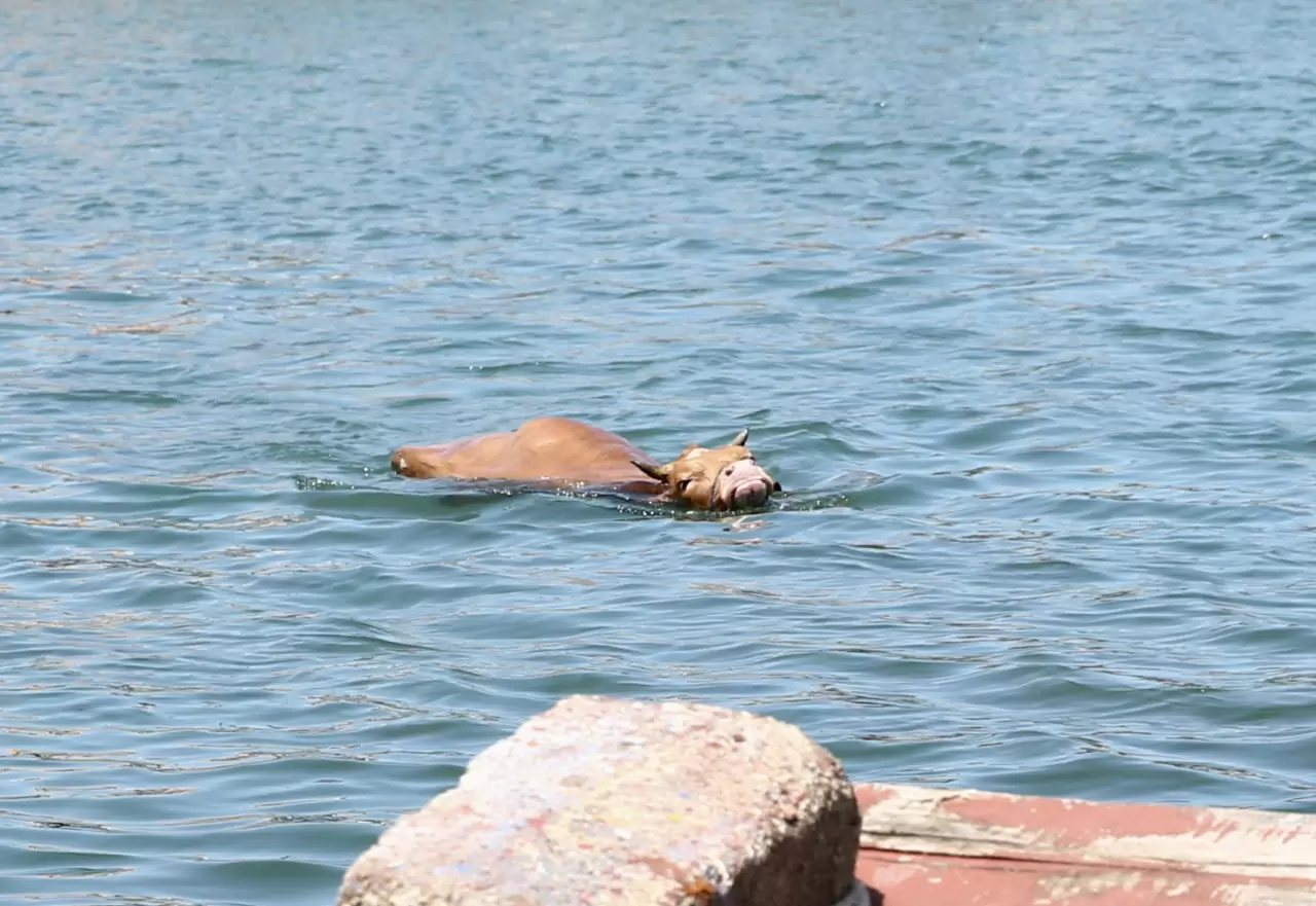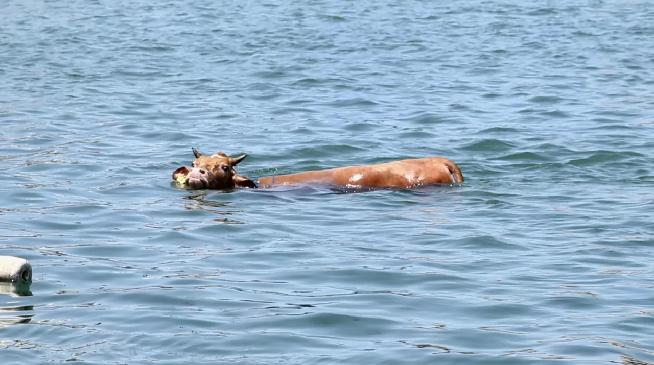 Yaklaşık 20 dakika suda kalan kurbanlık, karaya çıkarak barınaktaki bir balıkçı kulübesine girdi.