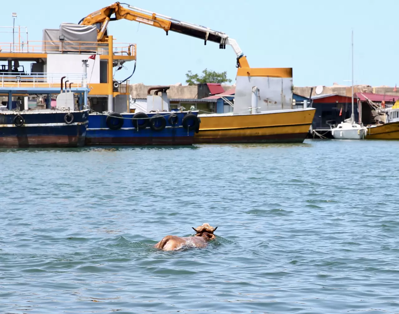 Yolda bir süre de trafiğin ters istikametine ilerleyen kurbanlık, daha sonra Kumyalı Balıkçı Barınağı'ndan denize atladı.