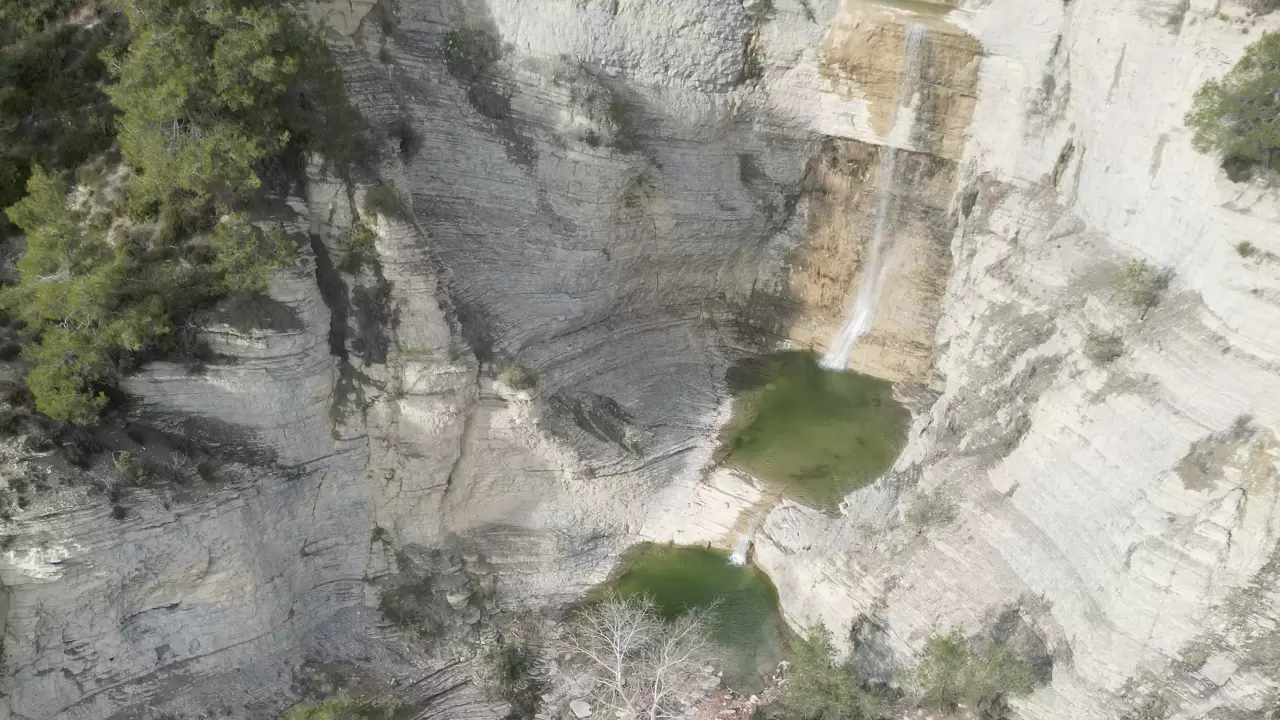 Yaklaşık 30 metre yükseklikten dökülen Şarlayan Şelalesi, yeniden oluşan manzarasıyla dikkat çekerken, ortaya çıkan görüntüler dron ile kayda alındı.