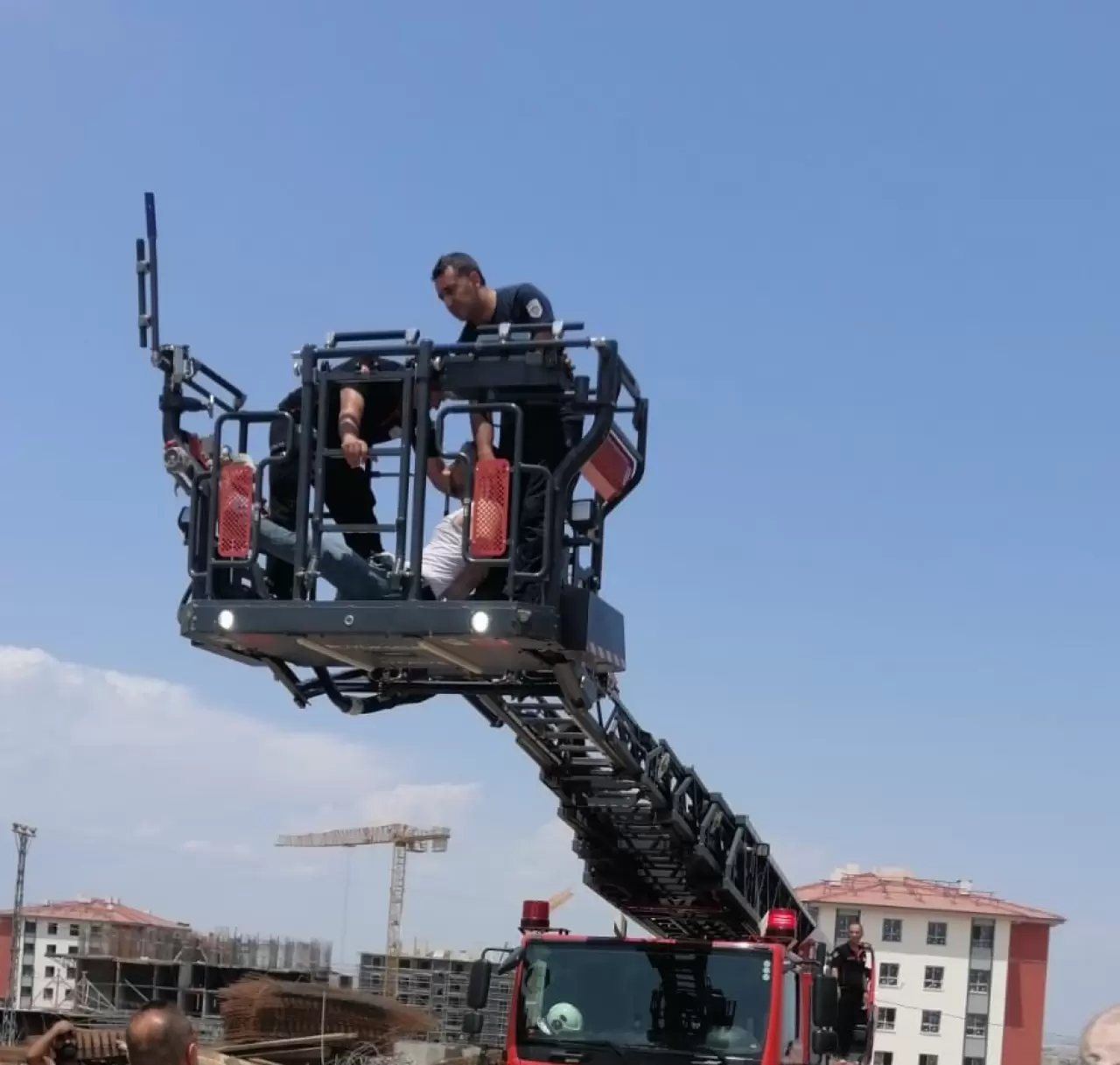 Yaklaşık 30 metre yüksekte mahsur kalan operatör, ihbar üzerine olay yerine çağrılan itfaiye ekipleri tarafından merdivenli araç yardımıyla çıkartıldı ve aşağıya indirildi.