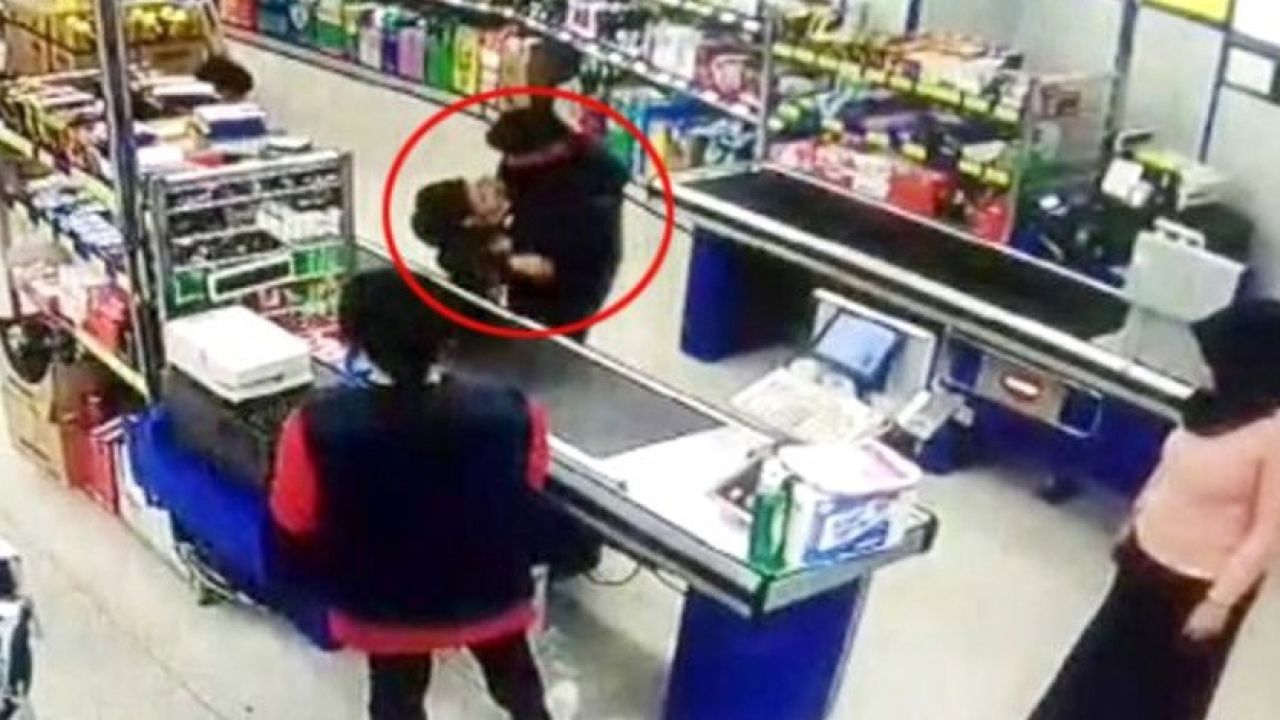 Daha sonra kasada para ödeyen kadın, bir anda çocuğun boğazından tutarak kasaya yatırdı, ardından da öteki kasaya fırlattı.