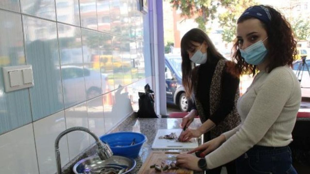 Arhavi ilçesinde 20 metrekare dükkan açan Kübra- Melda Çelenk kardeşler 'erkek işi 'söylemlerine aldırmadan balık ayıklıyor, ekmek paralarını kazanıyor.
