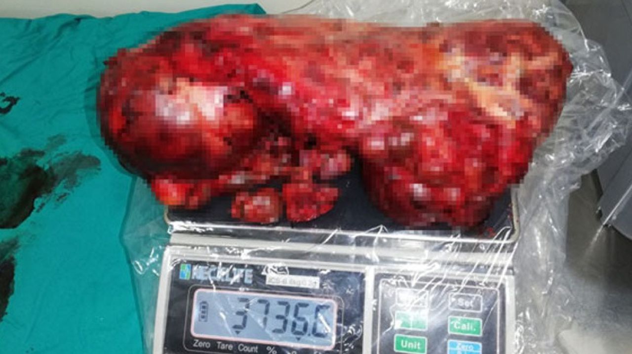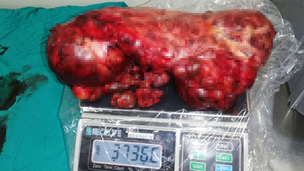Genel Cerrahi Uzmanı Dr. Nazmi Yaşar Sayım ise, "Bilgisayarlı tomografide karnın sol yarısını neredeyse tamamen kaplayan, orta hattı geçen, oldukça düzensiz sınırlı, yaklaşık 36 santim boyutlarında, olmaması gereken bir kitle saptadık. Bu kitlenin menşei her ne olursa olsun ameliyat ile alınması gerekiyordu. Hastamıza ve yakınlarına ameliyat edilmesi gereğini aktardık. Hastamızın rızasıyla hemen hastayı interne ederek gerekli ameliyat hazırlıklarına başladık. Yatırdıktan bir gün sonra ameliyata aldık ve dalağı da içerisine almış olan düzensiz yüzey içinde kistik alanlar bulunan, göğüs boşluğu ile karın boşluğunu ayıran diyafram dediğimiz yerden başlayıp, aşağıya kasık yani pelvis bölgesine uzanan oldukça büyük, dev boyutlarda, yaklaşık 4 kilogram ağırlığında bir kitle tespit ettik. Hastada bazı semptomlar oluştuğunu da görünce hemen ameliyata aldık." şeklinde konuştu.