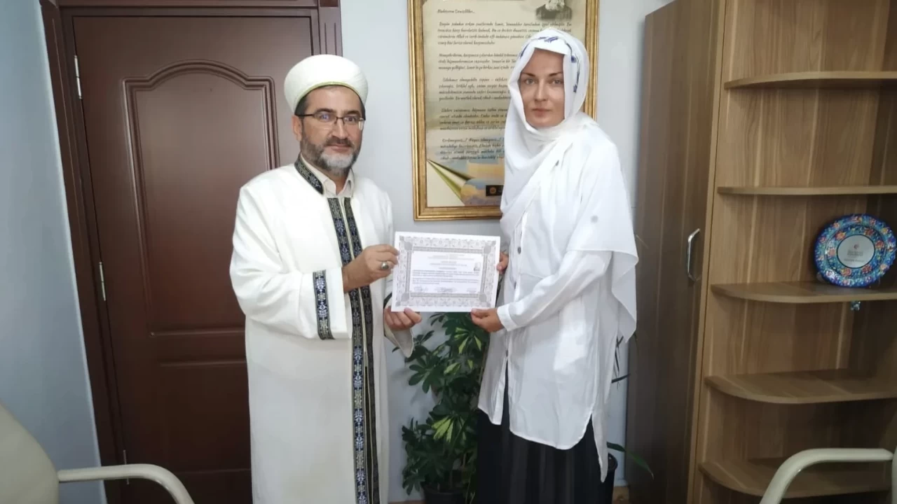 İlçe Müftü Vekili Şube Müdürü Ayhan Akar tarafından İslam dininin temel esasları hakkında Kurochkina'ya özlü bilgiler verildi.