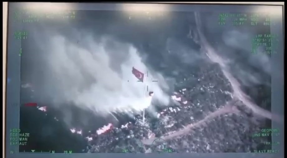 Bu sırada yangın söndürme helikopterleri art arda sortilerle alevlerin Türk bayrağına ulaşmasını ve bayrağın zarar görmesini engelledi. Sadece alevlere değil gönüllere de su serpen Orman ekiplerinin bayrak hassasiyeti kameralara yansıdı.