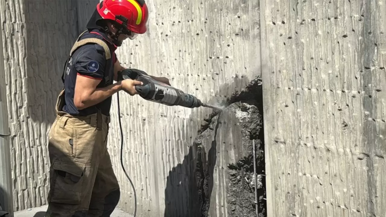 Kişinin bulunduğu yerden çıkarılması için itfaiye ekipleri, darbeli matkapla duvarı delmeye başladı.