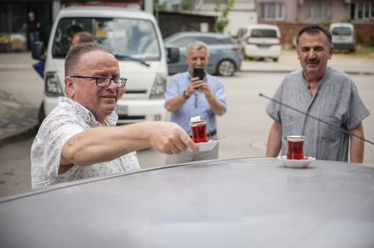 Bursa Osmangazi’de esnaflık yapan Ali İhsan Olcay, günlük çay ihtiyacını 50 metre uzaklıktaki çay ocağından ilginç bir yöntemle karşılıyor. Olcay, çaylarını otomobiliyle taşıyarak hem pratik bir çözüm sunuyor hem de bu sıra dışı uygulamasıyla çevresinde tebessüm yaratıyor.