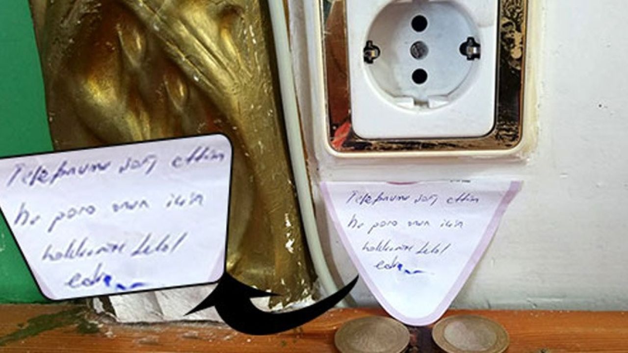 Sivas'ın Altınyayla ilçesindeki bir camide cep telefonunu şarj eden vatandaş, imam ve cemaatten "helallik" istediği not ile 2 lirayı prizin yanına bıraktı.