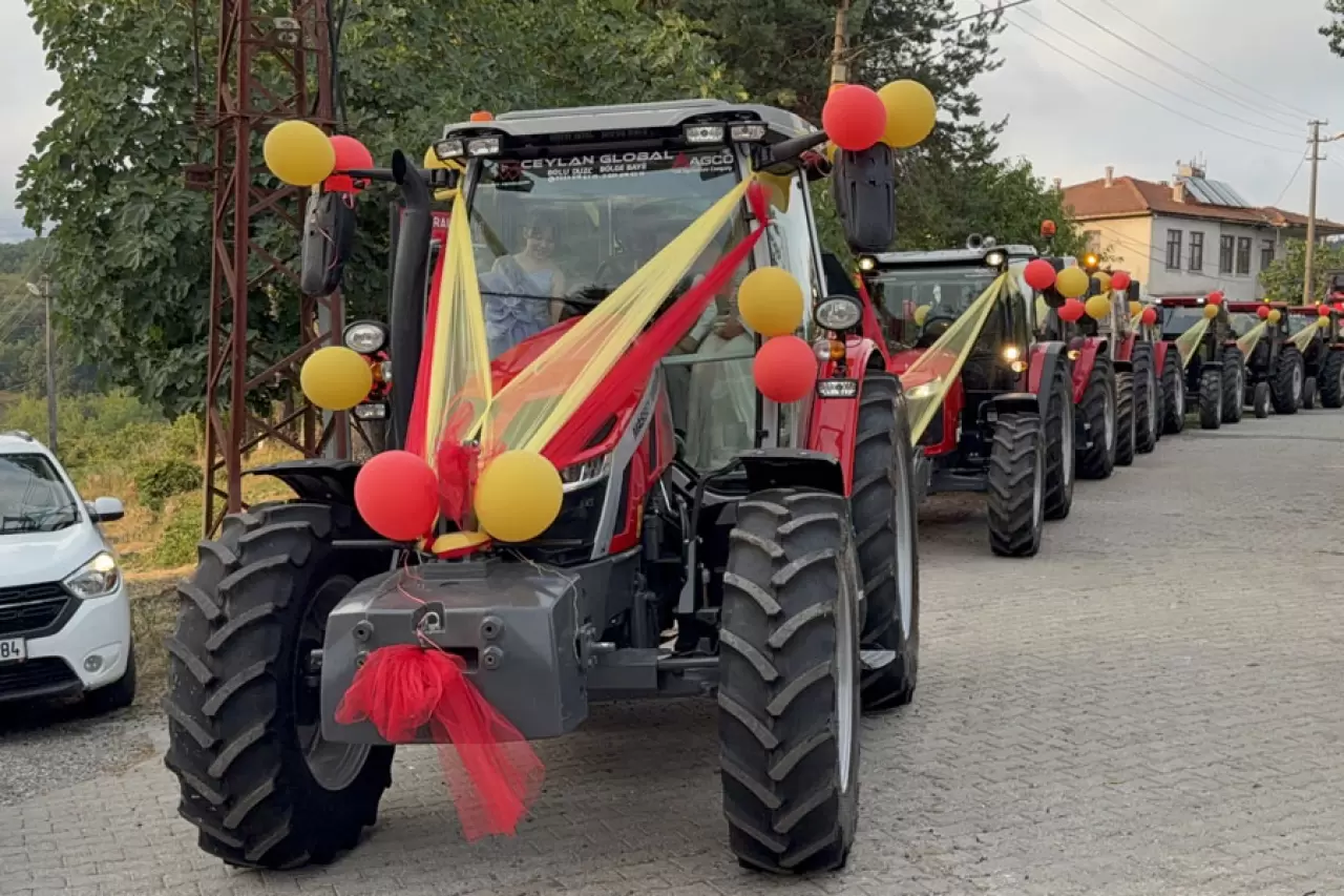 Düzce’de çiftçilik yapan Orhan Aktepe, sünnet olan oğlu Mahir Aktepe için sünnet aracını traktörden yaptı. Konuralp'de çiftçilikle uğraşan Orhan Aktepe’nin 5 yaşındaki oğlu Mahir Aktepe sünnet oldu. Traktörlere ilgisi olan Mahir, sünnetinde babasından traktör konvoyu yapmasını istedi. Oğlunun isteğini geri çevirmeyen baba Orhan Aktepe, çiftçi arkadaşlarını da organize ederek, 12 traktörlük konvoy düzenlerken, Galatasaraylı oğluna da sürpriz yapıp tüm araçları sarı kırmızıyla süsledi. Oğlunun isteğini kırmayarak böyle bir işlemde bulunduğunu söyleyen Orhan Aktepe, "Gençlerin çiftçiliğe yönelmesi için böyle bir etkinlik yapalım dedik. Üretime katkısı olsun yeni nesilin diye. Biz kendimizde çiftçiyiz zaten böyle bir fikir geldi aklımıza. Arkadaşlarla toplanıp böyle bir hareket yaptık. Şuan burda 12 traktör var. Gelmek istiysen arkadaşlarımızda oldu, trafiği tehlikeye atmayalım diye yeterli sayı oldu dedik. Bu hareketi çocuğum istedi zaten çiftçi oğlu olduğu için kendisi Galatasaraylı olduğu için böyle bir süsleme istedi" ifadelerini kullandı.