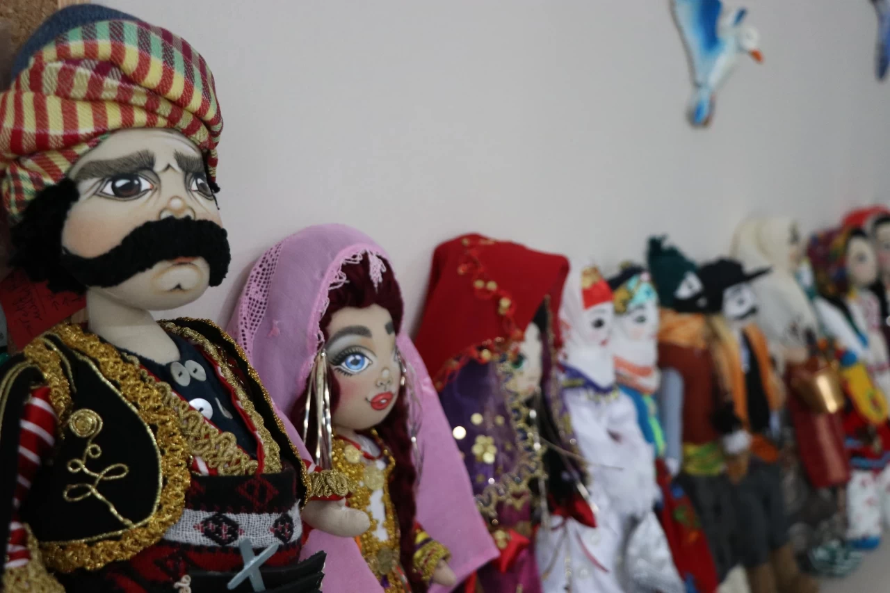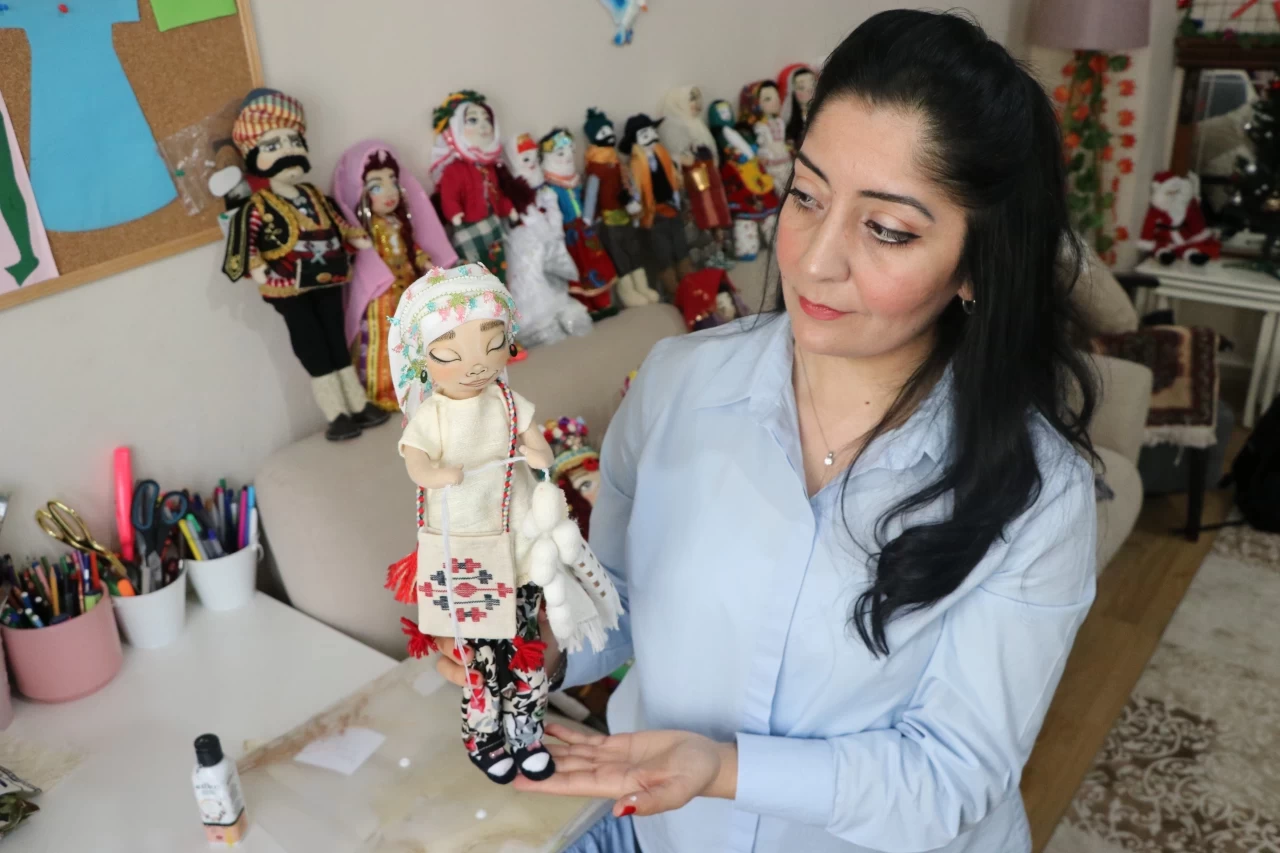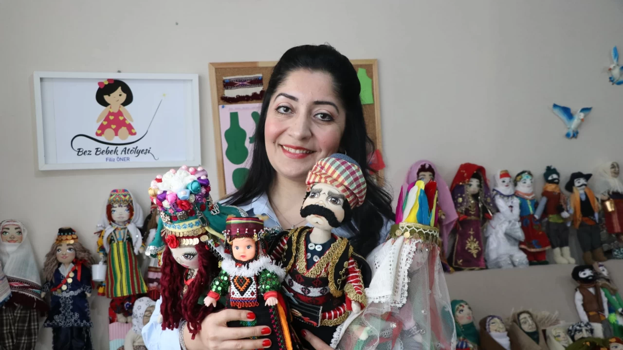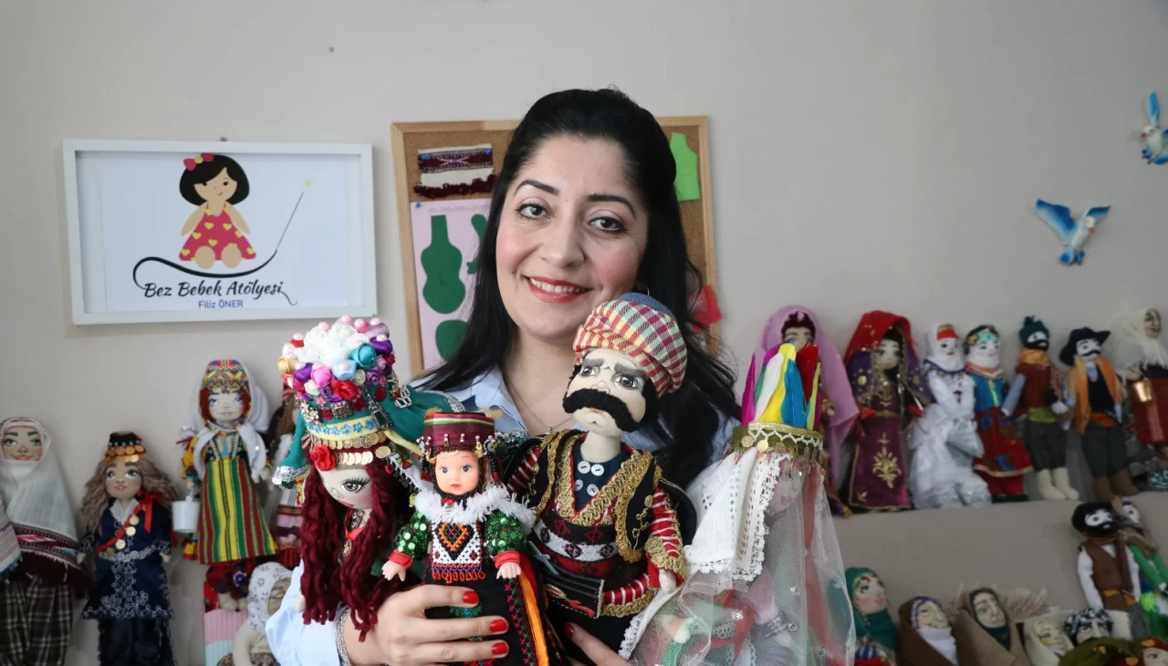 Çanakkale'de yaşayan coğrafya öğretmeni Filiz Öner, Anadolu'nun zengin giysi kültürünü, evinin salonuna kurduğu atölyesinde çeşitli kumaşlar, oyalar ve nakışları kullanarak tasarladığı yöresel bez bebeklere işliyor.