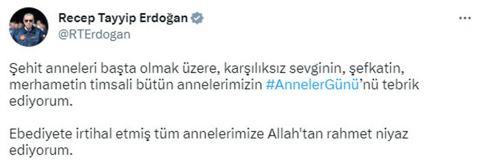 Cumhurbaşkanı Erdoğan, şehit annelerine öncelik vererek yaptığı paylaşımda şu ifadeleri kullandı: