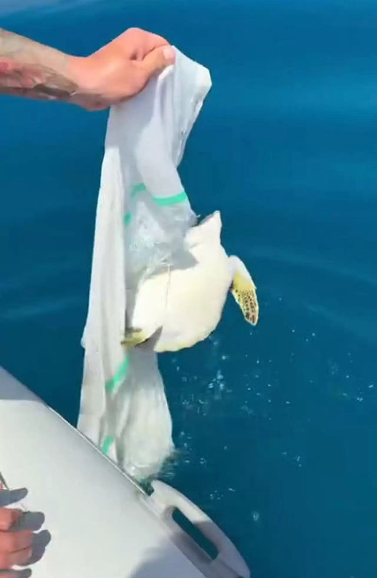 Tekneleriyle denize açılan balıkçılar, su yüzeyinde çırpınan yavru kaplumbağayı fark ederek hemen harekete geçti. Çuvalın içine sıkışmış ve boynuna misina dolanmış haldeki kaplumbağa tekneye alındı. Balıkçılardan biri, dikkatlice çuvalı keserek kaplumbağayı kurtardı. Ardından misina da dikkatle çıkarılarak hayvan özgürlüğüne kavuşturuldu.