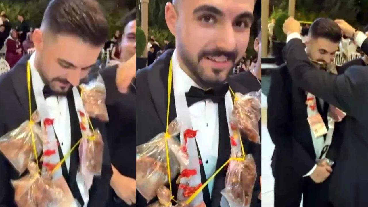 Gündeş, kardeşine takı olarak 5 tane pişmiş tavuk pirzola taktı. Doğan Gündeş’in poşetler içine bırakıp iple birbirine bağladığı pirzolaları damat Volkan Gündeş’in boynuna astı. Davetlileri gülümseten o anlar, kameraya yansıdı.