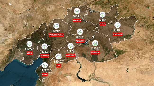 Osmaniye'de ise hava sıcaklığının en düşük 11, en yüksek 22 derece olması bekleniyor.