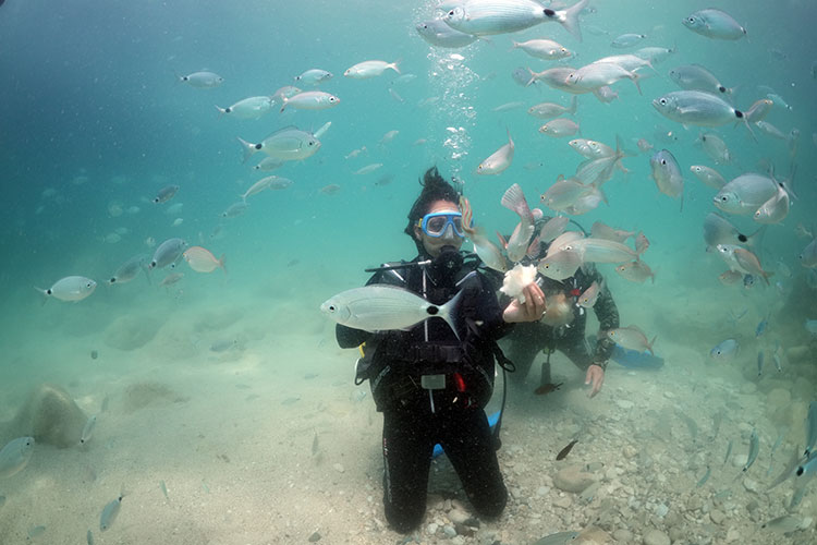 Gerekli eğitimin ve deneme dalışlarının ardından eğitmenler gözetiminde tüplü 5 metre dalan İnci, su altında balıkları besledi, deniz altını yakından görme imkanı buldu.