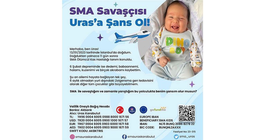 Aile yaşadığı bu zor süreçte bir yandan da zamanla yarışıyor ve bu yarışları her geçen gün artıyor. 2 buçuk aylık SMA’lı Uras bebeğin yetilerini kaybetmemesi için 6 aylık olmadan gen tedavisine başlaması gerekiyor ve yurtdışında yapılacak tedavi için gereken miktar 24 milyon TL.
