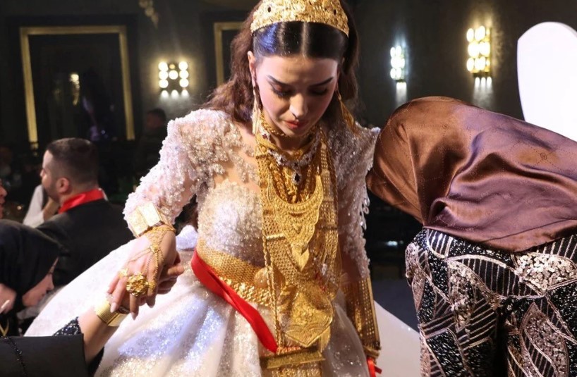 Altınların ağırlığı nedeniyle hareket edemeyen geline yakınları yardımcı olurken, altın takmayan davetliler ise salondaki sandığa para koyarak isimlerini yazdıkları zarfları attı.