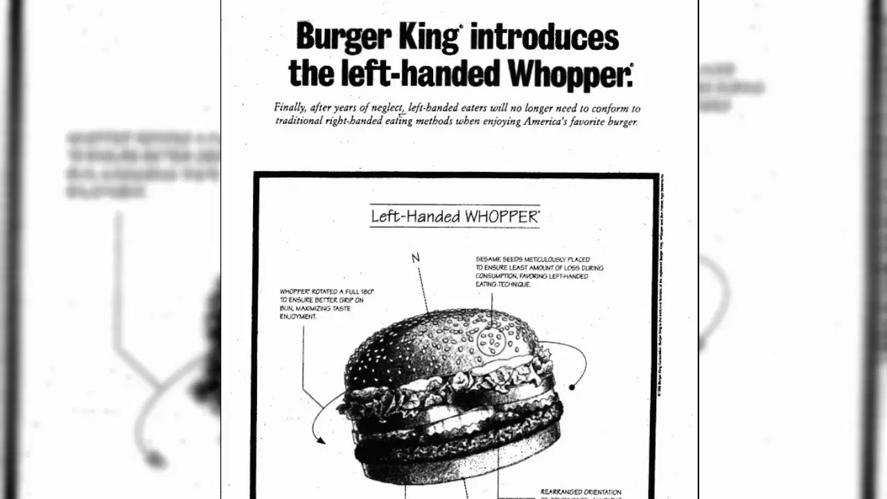 Ünlü fast-food zinciri, ABD genelinde tam sayfa gazete ilanı vererek solaklar için özel tasarlanmış bir burger çıkardığını duyurdu. İddiaya göre içindeki tüm malzemeler 180 derece döndürülmüştü.