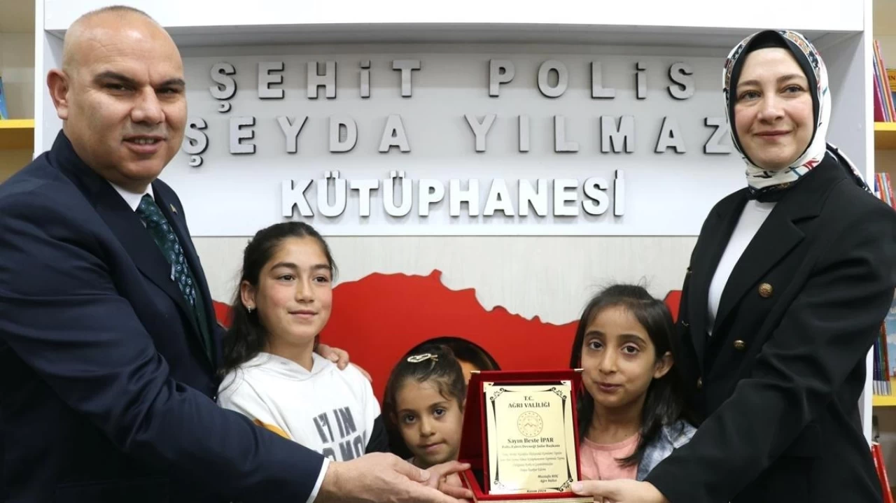 Kütüphanede incelemelerde bulunup çocuklarla sohbet eden Vali Koç, desteklerinden dolayı Polis Eşleri Derneği Ağrı Şube Başkanı İpar'a ve bir polis memuruna plaket verdi.
