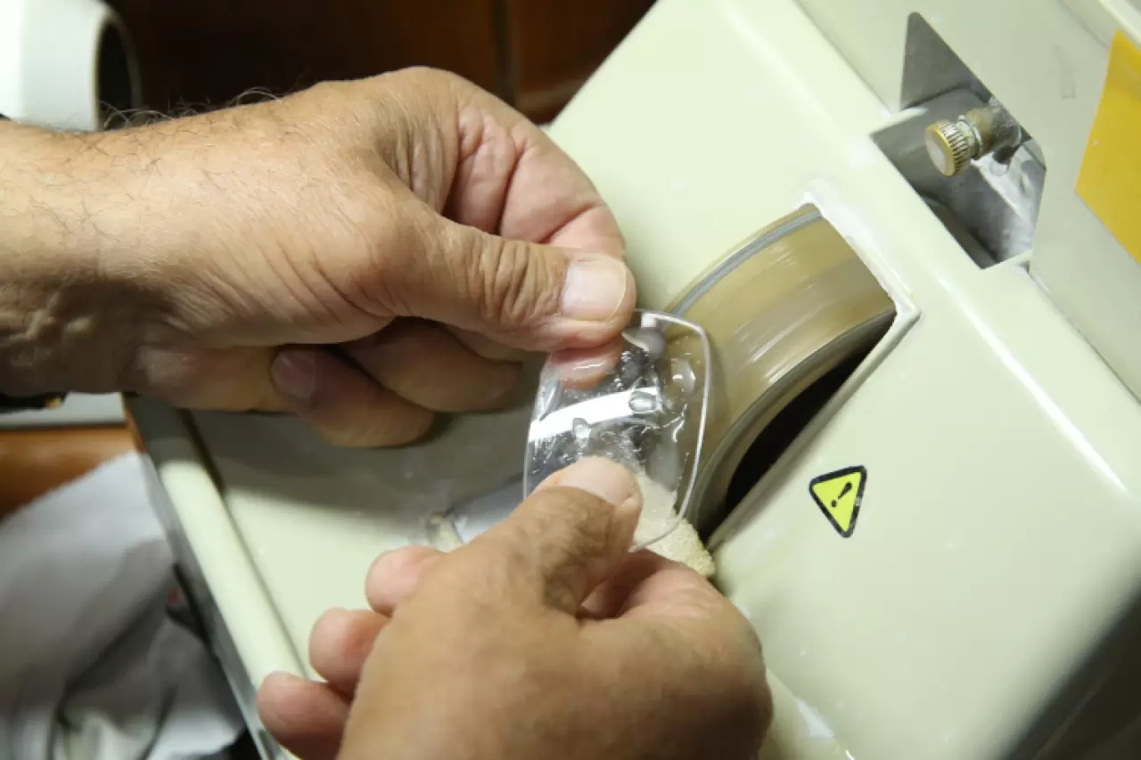 Sebebi, eskiden gözlük camları mineraldi, yani camdı. Organik mika cam yoktu. Kalıp kartondan kalıp kesiliyordu, çerçeveye alıştırılıyordu. O karton kalıba göre cam elmasla kesiliyordu, ondan sonra el pensiyle kırılıyordu. Kırılan gözlüğün kenarının balık sırtı v şeklinde tıraşlanması gerekiyordu. O el taşıyla yapılırdı. Gözlük camı yaparken sürtüle sürtüle zaman içinde parmakların izi silinmiş."
