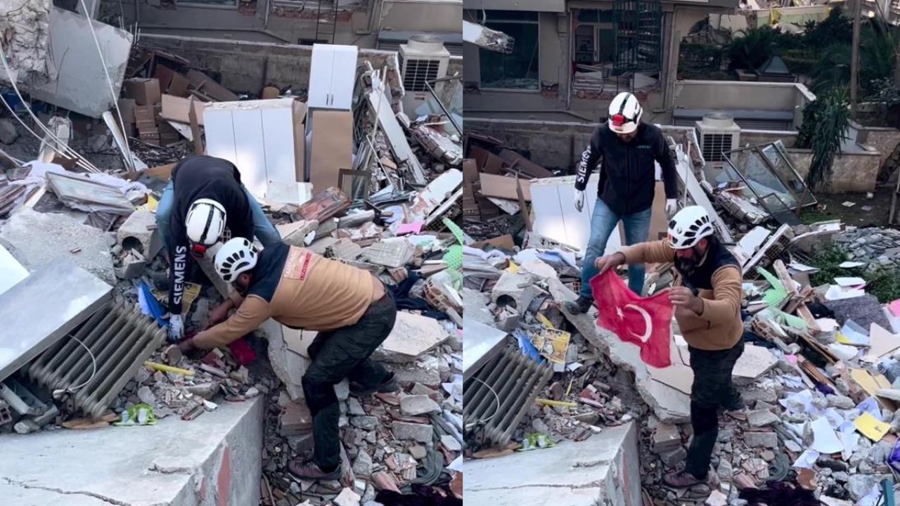 Bölgede bulunan arama kurtarma gönüllüleri enkazda çalışma yaptıkları esnada Türk Bayrağını enkazdan çıkartması dikkatlerden kaçmadı.