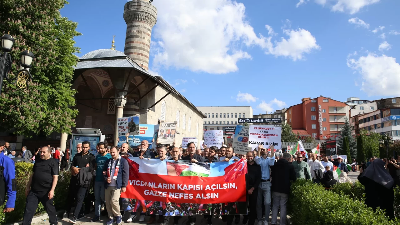 Kent merkezindeki Lala Paşa Cami önünde bir araya gelen vatandaşlar, Türk, Filistin ve Doğu Türkistan bayrakları eşliğinde, taşıdıkları döviz ve pankartlarla Yakutiye Medresesi'ne yürüdü.