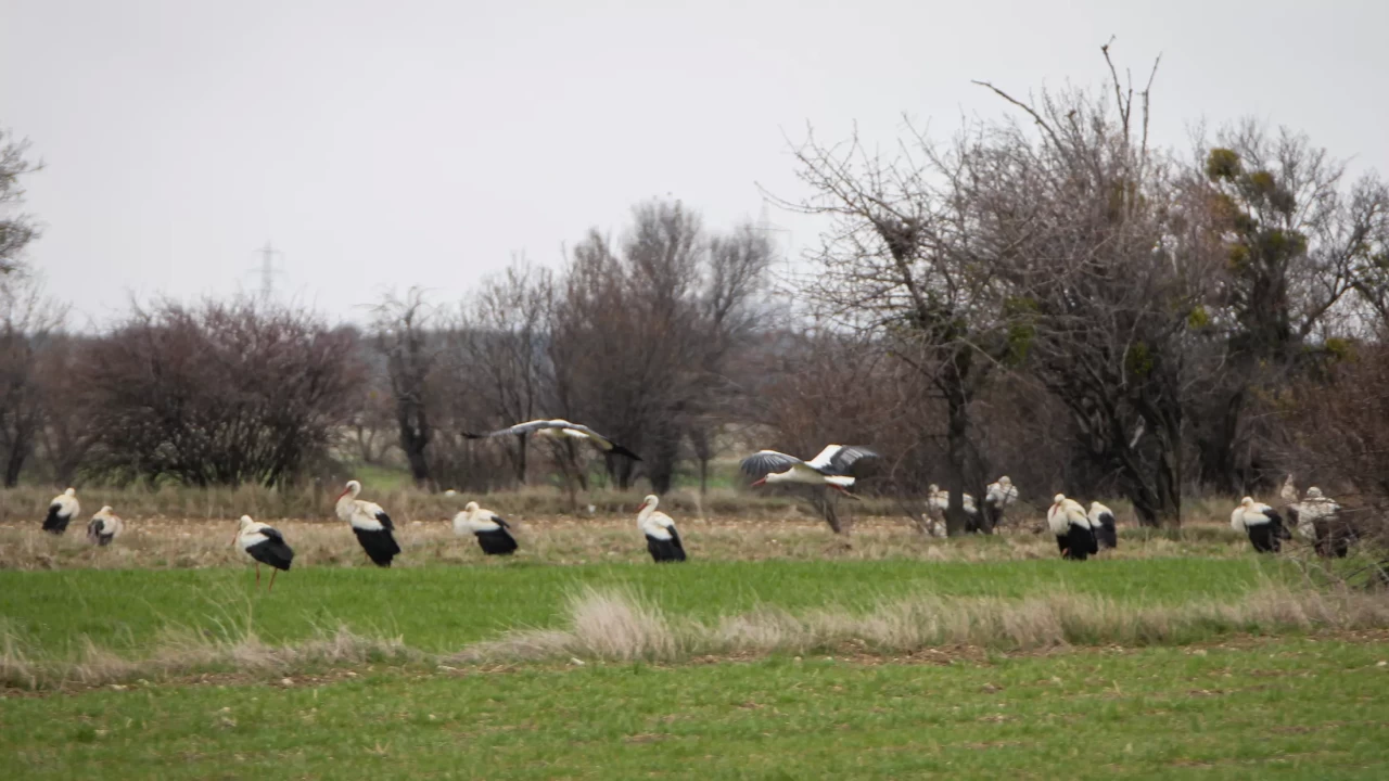 Göç yolundaki onlarca leylek, Kütahya’nın Domaniç ilçesindeki arazilerde mola verdi.