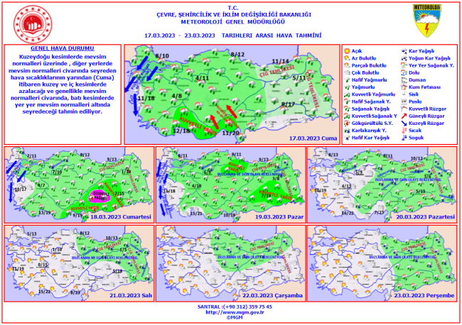 Kuzeydoğu kesimlerde mevsim normalleri üzerinde, diğer yerlerde mevsim normalleri civarında seyreden hava sıcaklıklarının bugünden itibaren kuzey ve iç kesimlerde azalacağı ve genellikle mevsim normalleri civarında, batı kesimlerde yer yer mevsim normalleri altında seyredeceği tahmin ediliyor.