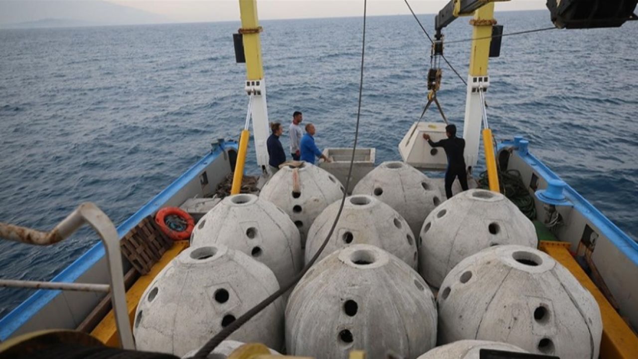 Büyük İskender Biyoaktif Yapay Resif Topları Projesi kapsamında İskenderun Körfezi'nde iki noktaya bırakılması planlanan 60 yapay resiften 11'i balıkçı barınağında tekneye yüklendi.