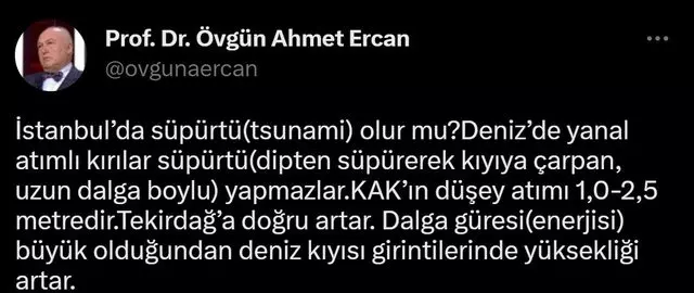 Türkiye deprem yaralarını sarmaya çalışıyor. Prof. Dr. Övgün Ahmet Ercan; Kilis, Diyarbakır, Adana, Osmaniye, Şanlıurfa, Adıyaman, Gaziantep, Malatya ve Hatay'da hissedilen 7.7 ve 7.6 şiddetindeki Kahramanmaraş depremi sonrası yeni bir açıklamada bulundu. Kahramanmaraş'ta gerçekleşen depremlerin ardından gözler olası İstanbul depremine çevrildi. Prof. Dr. Övgün Ahmet Ercan Twitter hesabı üzerinden yaptığı açıklamada "İstanbul'da tsunami olur mu?" sorusuna açıklık getirdi.