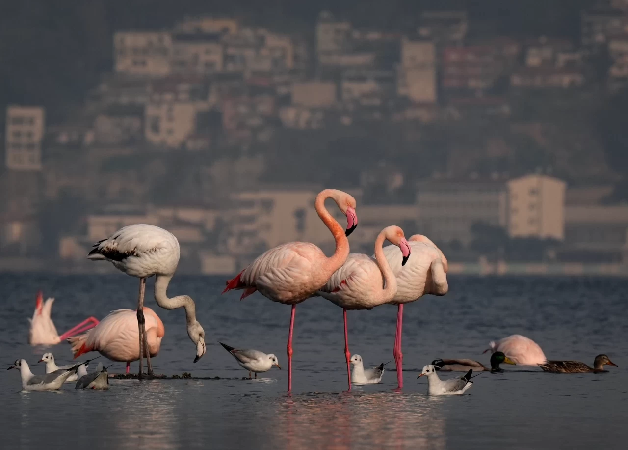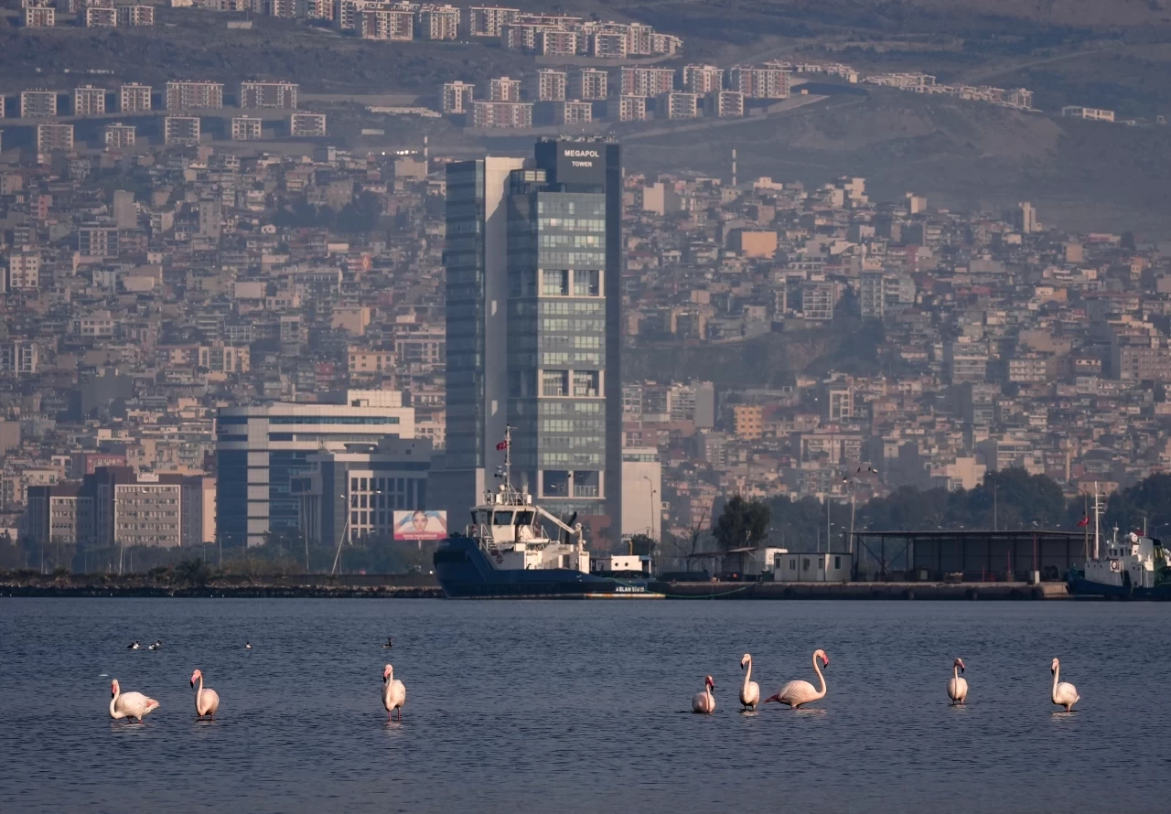 İzmir'de yaşam alanları Gediz Deltası olan flamingoların bir kısmı, kış aylarında besin arayışıyla iç körfeze yönelerek adeta şehirle bütünleşiyor.
