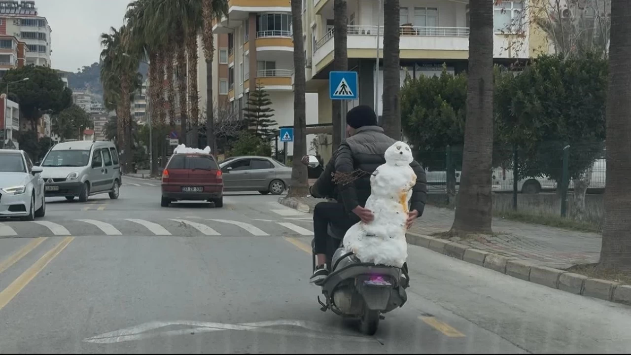 Mersin'in Anamur ilçesinde kar yağışını fırsat bilen vatandaşlar, motosikletle kardan adam taşıyan 2 arkadaşın keyifli anları dikkat çekti. Vatandaşlar, lapa lapa yağan karın tadını çıkarırken, o anlar cep telefonuyla kaydedildi.