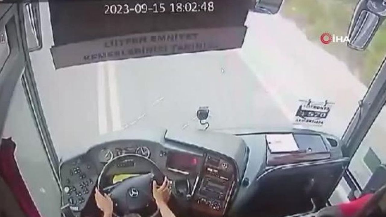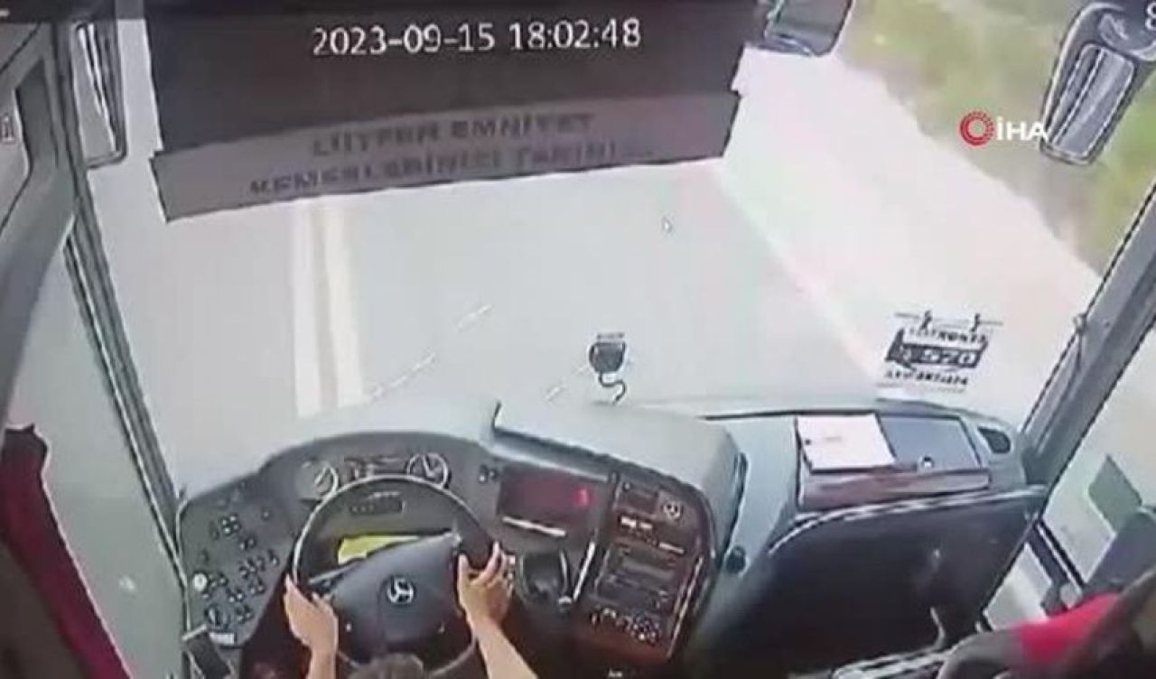 Kaza anları yolcu otobüsünde bulunan güvenlik kamerasına da saniye saniye yansıdı. Otobüsün kendi şeridinde ilerlediği anlarda, otomobilin bir anda otobüsün önüne çıkması ve altına girmesi saniye saniye kaydedildi. Çarpmanın etkisiyle ön koltukta oturan bir kadın yolcu da yerinden savrularak şoförün yanına düştü.