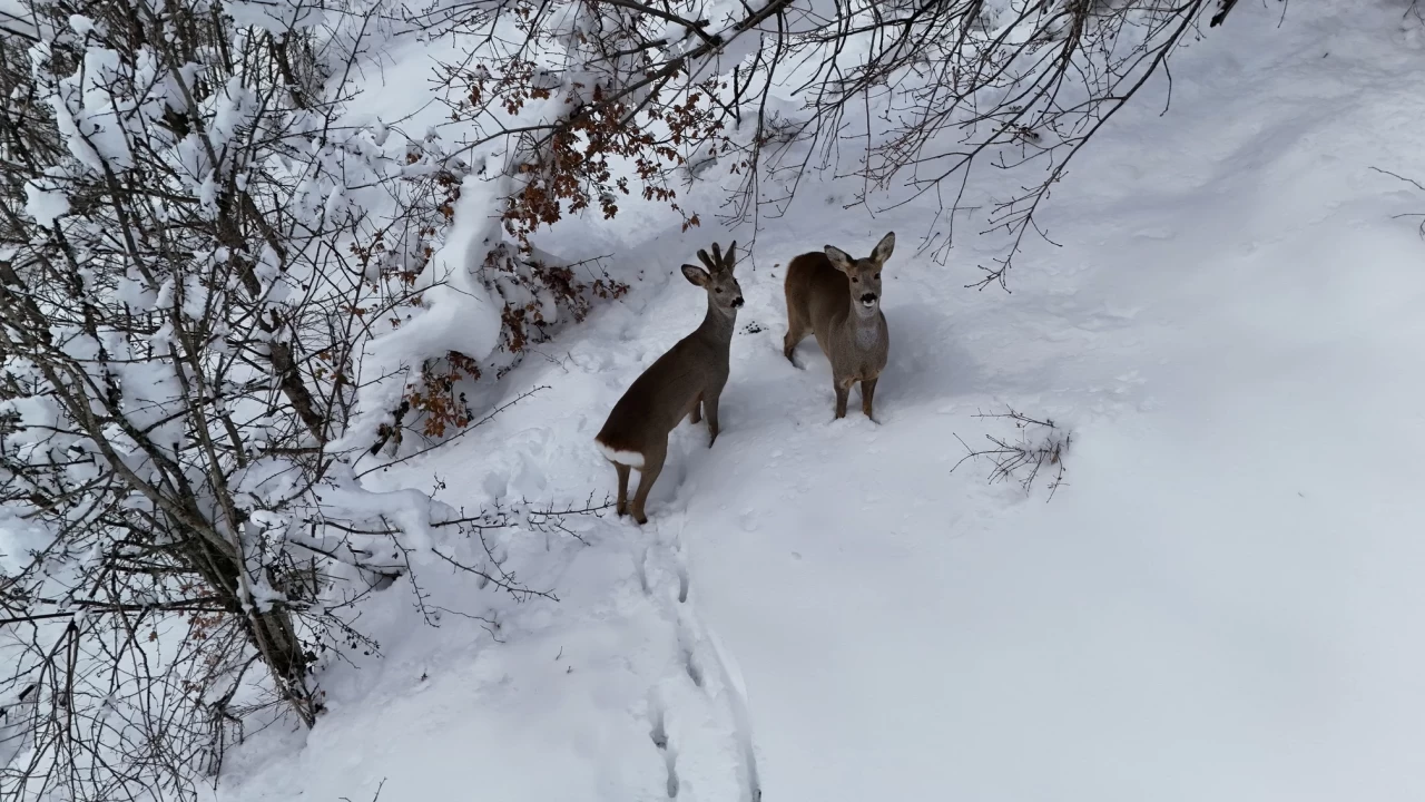 Dronla karacalara yakınlaşan Çalık, karacaları bir süre kayıt altına aldı. Açıklama yapan Çalık, kar videosu çekerken bir hareketlilik fark ettiğini belirtti.