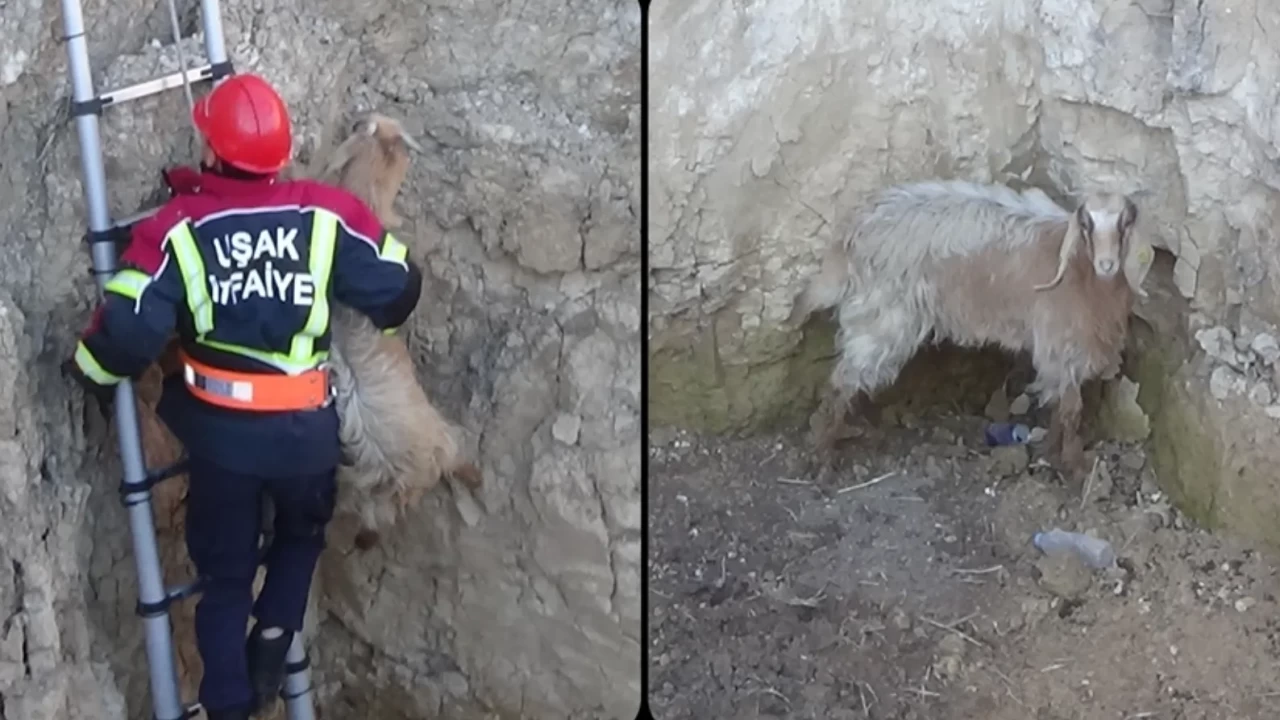 İhbar üzerine bölgeye gelen itfaiye ekipleri, merdiven yardımıyla kuyuya inerek keçiyi bulunduğu yerden çıkardı.